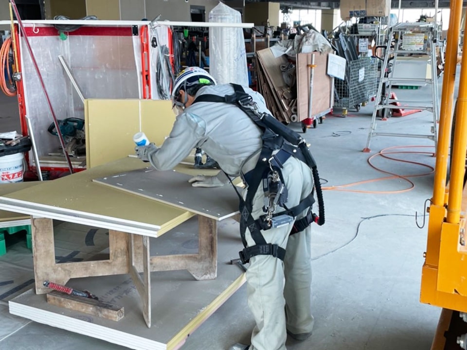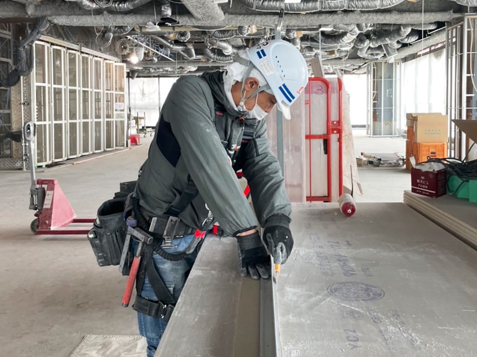 内装の仕上工事がメインです。天井・壁などの軽量下地組み作業や、石こうボードの張り付けを行ないます。未経験の方は手元作業から覚えていただき、現場で徐々に仕事のノウハウを覚えていきましょう。頑張り次第ですぐに現場仕事ができるようになり、数年で立派な職人になることも可能です!